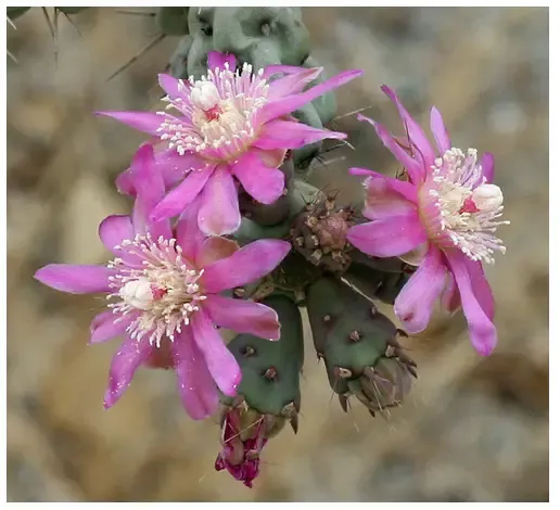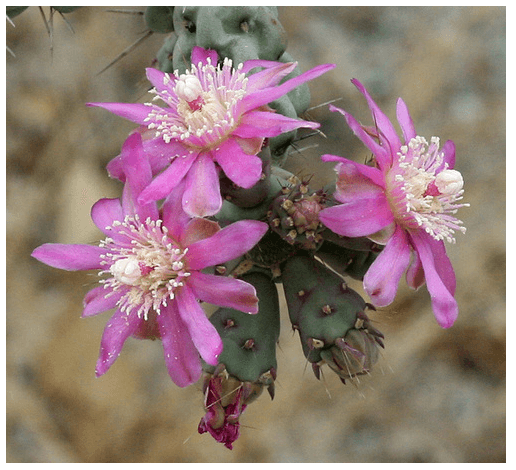 | Cylindropuntia cholla | Cylindropuntia cholla est originaire de la basse californie au Mexique. Peu présent dans le commerce, il prends la forme de buisson avec des branches très épineuses. Il produit des fleurs roses très jolies. Il est facile à entretenir et supporte les très fortes chaleurs. Il n’a pas besoin d’arrosage fréquent. |